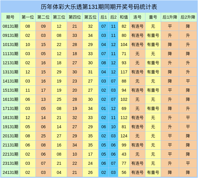 和值分析:在历史同期开奖中,前区和值出现范围在43-124之间,区间内的最大波动差值为81,其中小数和值开出频次较高,共出现了9次,当前小数和值开出了9年,今年同期预计和值继续走小。